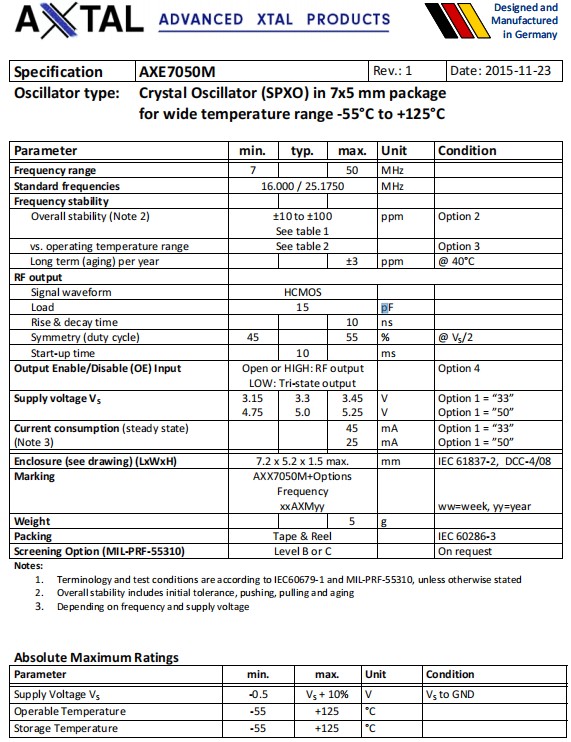 AXE7050M‐50-25‐4F-45.000MHz,7050mm,45MHz,AXTAL晶振,AXE7050M,有源晶振,參數表