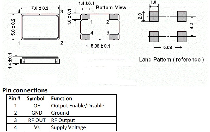 AXE7050M‐50-25‐4F-45.000MHz,7050mm,45MHz,AXTAL晶振,AXE7050M,有源晶振,尺寸圖