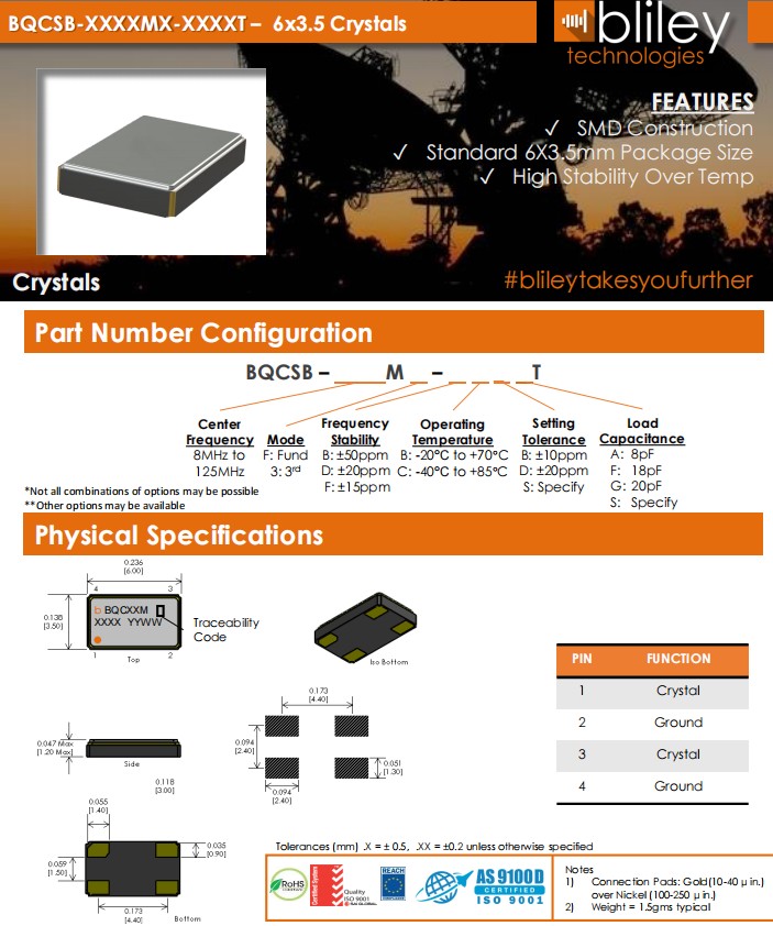 BQCSB-33MF-BCDFT,33MHz,6035mm,Bliley高穩(wěn)定性晶振,BQCSB,石英晶體諧振器,美國進口晶振,Bliley百利晶振,型號:BQCSB系列晶振,編碼為:BQCSB-33MF-BCDFT,頻率為:33.000MHz,小體積晶振尺寸:6.0x3.5x1.2mm,四腳貼片晶振,無源晶振,石英晶振,6035晶振,石英晶體諧振器,SMD晶振,貼片石英晶振,無鉛晶振,工作溫度范圍:-40℃至+85℃。具有超小型,輕薄型,高精度,高性能,高品質(zhì),高質(zhì)量,耐熱及耐環(huán)境特點。進口晶振,被廣泛應(yīng)用于:通訊設(shè)備,無線網(wǎng)絡(luò),藍牙模塊,物聯(lián)網(wǎng),車載晶振,醫(yī)療設(shè)備,安防設(shè)備,平板電腦,智能家居,數(shù)碼電子等。