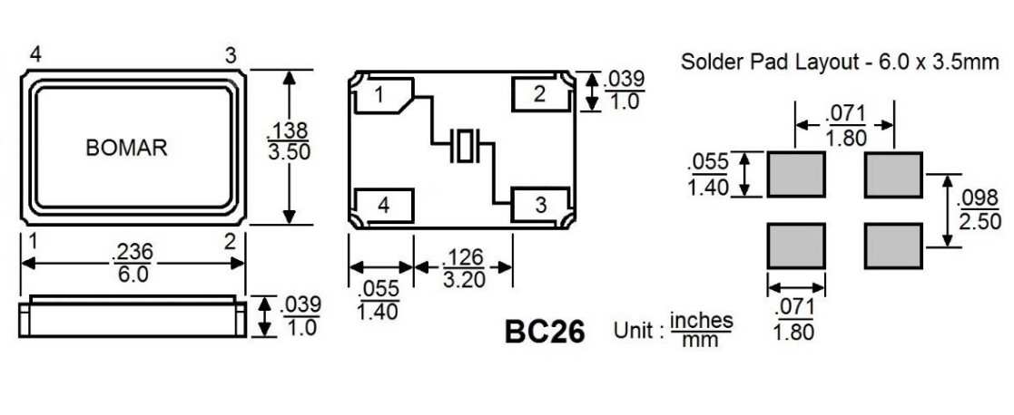 BC26EFI120-40.000000,6035mm,40MHz,Bomar四腳貼片晶振,BC26,測試設備晶振,尺寸圖