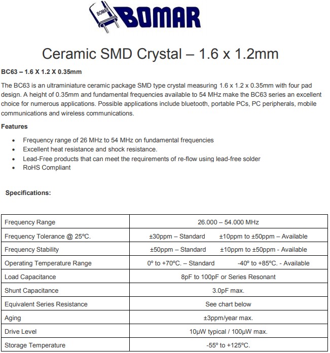 Bomar博馬爾晶振,BC63EFI120-30.000000,智能手機6G晶振,BC63AED120-45.000000,超小型晶振,參數(shù)表