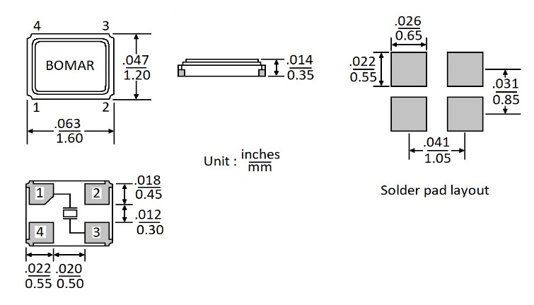 Bomar博馬爾晶振,BC63EFI120-30.000000,智能手機6G晶振,BC63AED120-45.000000,超小型晶振,尺寸圖