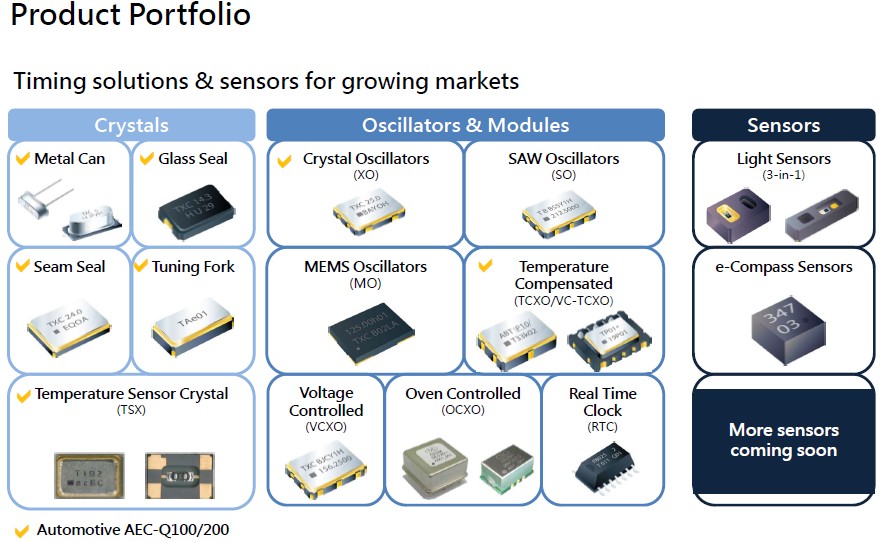 臺灣晶技為一專業(yè)之頻率組件與感測組件供貨商,自1983年成立以來,始終致力于石英晶體相關諧振器(Crystal)、振蕩器(Oscillator) 等頻率組件之研發(fā)、設計、生產(chǎn)"9HT10-32.768KBZF-T"與銷售,并因應市場應用與需求,透過自主核心技術,成功開發(fā)出各式感測組件(Sensor),產(chǎn)品可廣泛使用于行動通訊、穿戴式裝置、物聯(lián)網(wǎng)、服務器儲存設備、車用、電信、醫(yī)療…等市場.