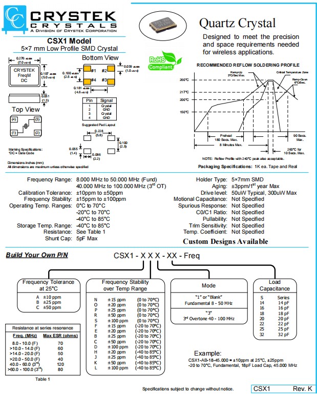 CSX1-BH3-20-45MHz,CRYSTEK瑞斯克晶振,SMD石英晶體,CSX1-AL1-16-26MHz,6G無(wú)線應(yīng)用晶振,參數(shù)表