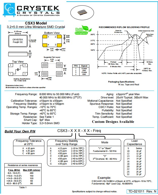 Crystek進口晶振,CSX3-AB1-18-19.680,石英晶體諧振器,CSX3-BE3-12-24.000,6G電信晶振,參數表