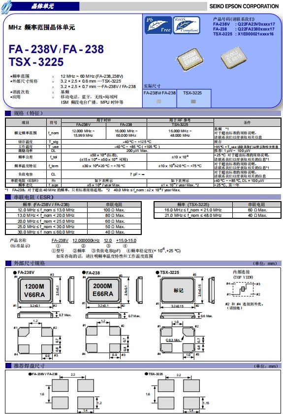 MPU時鐘專用晶振FA-238,Q22FA23800001,3225mm,12pF,20MHz,±50ppm, 日本EPSON愛普生株式會社,進口晶振FA-238,產品編碼:Q22FA23800001,產品型號:FA-238V 20.000000MHz 12.0 ±15.0,是一款小體積晶振尺寸3.2x2.5x0.7mm四腳貼片晶振,Q22FA23800022無源晶振,石英晶振,Q22FA23800063石英晶體諧振器,無鉛環(huán)保晶振,頻率為20MHz,工作溫度范圍:-40 °C to +85 °C (+105 °C),具有超小型,輕薄型,高品質,高質量,耐熱及耐環(huán)境特點,應用于智能手機,藍牙模塊,無線網絡,ISM頻帶收音機,MPU時鐘,車載控制器,汽車音響,汽車電子控制板,醫(yī)療設備,平板電腦,數碼電子等應用。