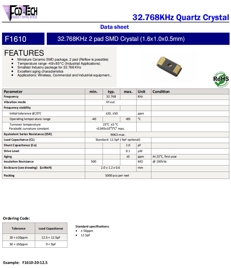 F1610‐20‐12.5,32.768KHz,1610mm,FCD-Tech時鐘晶振,F1610,超小型晶振,荷蘭進口晶振,FCD-Tech晶振,型號:F1610,編碼為:F1610-20-12.5,負載電容12.5pF,精度±20ppm,頻率為:32.768KHz,工作溫度范圍:-40℃至+85℃,小體積晶振尺寸:1.6x1.0x0.5mm,音叉晶體,無源晶振,兩腳貼片晶振,手表水晶,石英晶振,石英晶體諧振器。具有超小型,輕薄型,高性能,高品質,耐熱及耐環境,優良的老化特性。被廣泛應用于:通訊設備晶振,無線網絡晶振,藍牙模塊晶振,時鐘晶振,可穿戴設備,鐘表電子晶振,儀器儀表設備晶振,數字顯示晶振,商業和工業設備等應用。