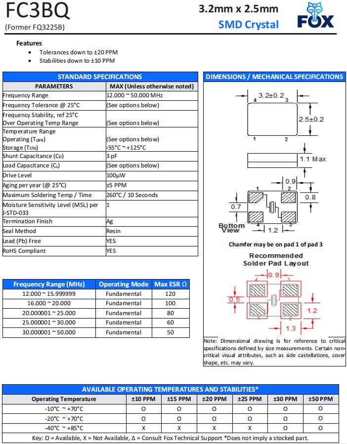 | FQ3225B-25.000 | Fox晶振 | FQ3225B | 25MHz | ±50ppm |