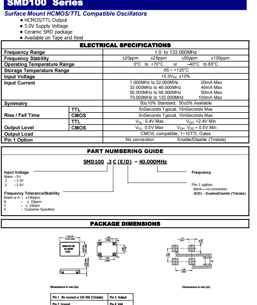 GED時鐘振蕩器,6GWIFI應用晶振,SMD100.3C(E/D)-50.000MHz 參數表