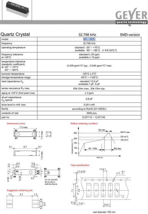 Geyer晶振,KX-327L晶振,石英晶體,貼片表晶32.768K系列具有超小型,薄型,質(zhì)地輕的表面貼片音叉型石英晶體振蕩器,晶振產(chǎn)品本身具備優(yōu)良的耐熱性,耐環(huán)境特性,在辦公自動(dòng)化,家電領(lǐng)域,移動(dòng)通信領(lǐng)域可發(fā)揮優(yōu)良的電氣特性,符合無(wú)鉛標(biāo)準(zhǔn),滿足無(wú)鉛焊接的回流溫度曲線要求,金屬外殼的石英晶振使得產(chǎn)品在封裝時(shí)能發(fā)揮比陶瓷晶振外殼更好的耐沖擊性能..