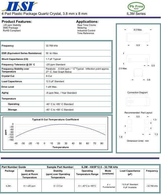 ILSI晶振,IL3M晶振,IL3M-HX5F12.5-32.768kHz晶振,32.768K時鐘晶體具有小型,薄型,輕型的貼片晶振表面音叉型晶體振蕩器,產品具有優良的耐熱性,耐環境特性,可發揮晶振優良的電氣特性,符合RoHS規定,滿足無鉛焊接的高溫回流溫度曲線要求,金屬外殼的封裝使得產品在封裝時能發揮比陶瓷振蕩器外殼更好的耐沖擊性.