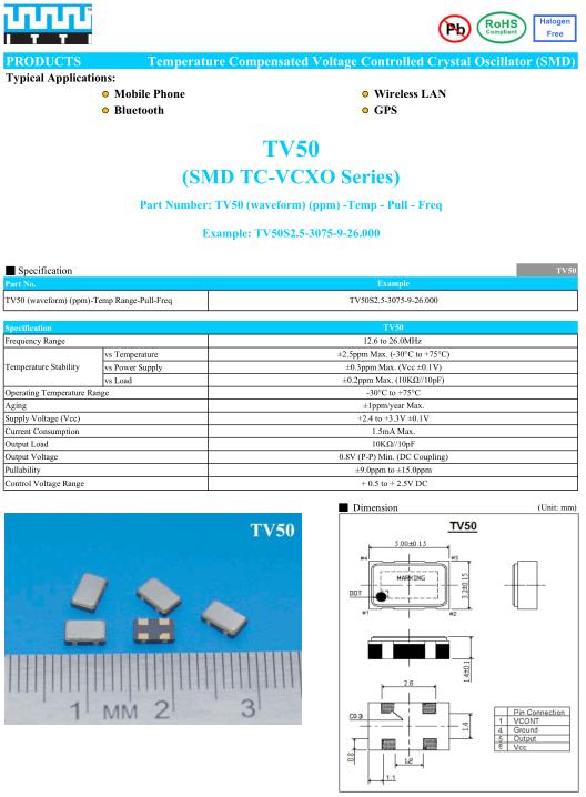 ITTI晶振,TV50晶振,TV50S2.5-3075-9-24.000晶振,5032mm體積的石英晶體振蕩器,有源晶振,該產品可驅動2.5V的溫補晶振,壓控晶振,VC-TCXO晶體振蕩器產品,電源電壓的低電耗型,編帶包裝方式,可對應自動高速貼片機自動焊接,及IR回流焊接(無鉛對應),為無鉛產品,超小型,質地輕.產品被廣泛應用到集成電路,程控交換系統,無線發射基站.