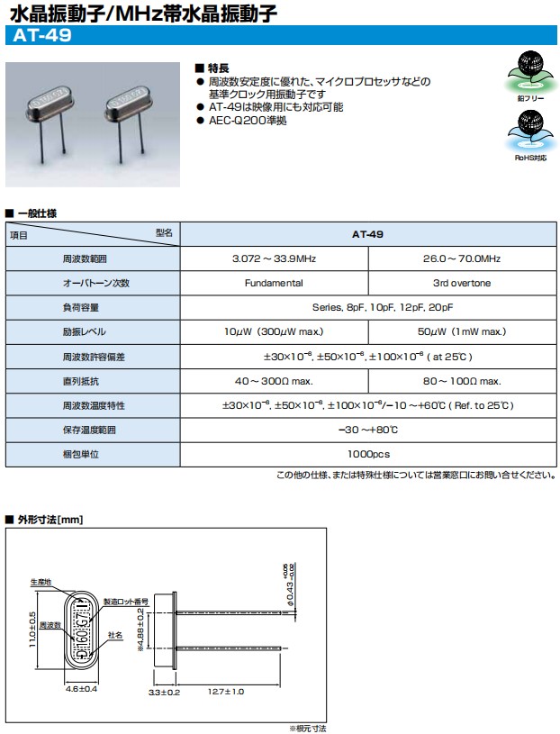 KDS石英晶振,AT-49橢圓型插件晶振,1AY289002DB進口晶振,無源晶振,數(shù)碼電子晶振,插件石英晶振最適合用于比較低端的電子產(chǎn)品,比如兒童玩具,普通家用電器,即使在汽車電子領(lǐng)域中也能使產(chǎn)品高可靠性的使用.并且可用于安全控制裝置的CPU時鐘信號發(fā)生源部分,好比時鐘單片機上的石英晶振,在極端嚴酷的環(huán)境條件下,晶振也能正常工作,具有穩(wěn)定的起振特性,高耐熱性,耐熱循環(huán)性和耐振性等的高可靠性能。