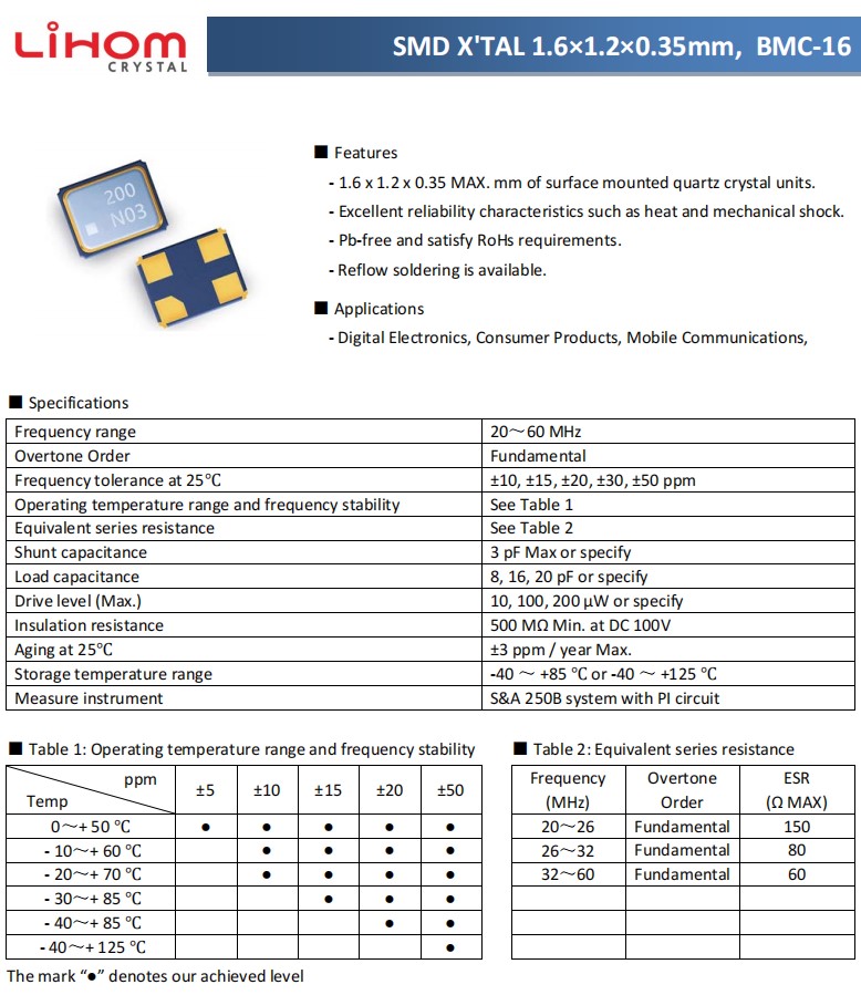 Lihom力宏無源晶振,BMC-16,數(shù)字電子產(chǎn)品6G晶振,1612mm石英晶振,韓國進(jìn)口晶振,參數(shù)表