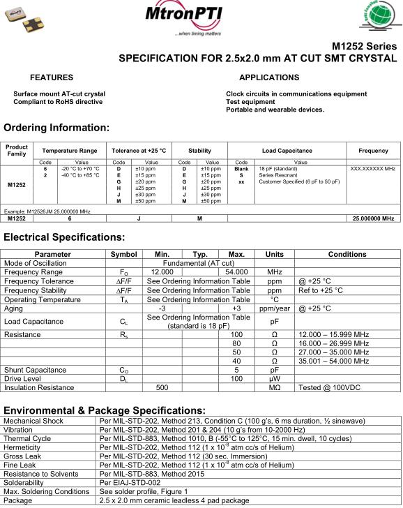MtronPTI晶振,M1252晶振,M12526JM24.000000MHz晶振,小型貼片石英晶振,外觀尺寸具有薄型表面貼片型石英晶體振蕩器,特別適用于有小型化要求的市場(chǎng)領(lǐng)域,比如智能手機(jī),無(wú)線藍(lán)牙,平板電腦等電子數(shù)碼產(chǎn)品.晶振本身超小型,薄型,重量輕,晶體具有優(yōu)良的耐環(huán)境特性,如耐熱性,耐沖擊性,在辦公自動(dòng)化,家電相關(guān)電器領(lǐng)域及Bluetooth,WirelessLAN等短距離無(wú)線通信領(lǐng)域可發(fā)揮優(yōu)良的電氣特性,滿足無(wú)鉛焊接的回流溫度曲線要求.