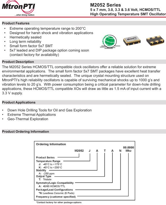MtronPTI晶振,M2052晶振,M2052JATAN16.0000MHz晶振,小型SMD有源晶振,從最初超大體積到現在的7050mm,6035mm,5032mm,3225mm,2520mm體積,有著翻天覆地的改變,體積的變小也使產品帶來了更高的穩定性能,接縫密封石英晶體振蕩器,精度高,覆蓋頻率范圍寬的特點,SMD高速自動安裝和高溫回流焊設計,Optionable待機輸出三態輸出功能,電源電壓范圍:1.8V~5V,高穩定性,低抖動,低功耗,主要應用領域:無線通訊,高端智能手機,平板筆記本WLAN,藍牙,數碼相機,DSL和其他IT產品的晶振應用,三態功能,PC和LCDM等高端數碼領域,符合RoHS/無鉛.