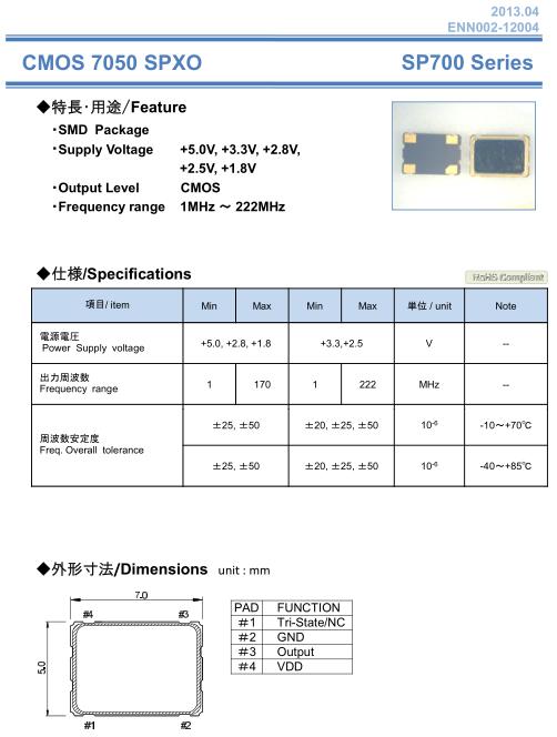 NAKA晶振,SP700晶振,SPXO振蕩器,小型SMD有源晶振,從最初超大體積到現在的7050mm,6035mm,5032mm,3225mm,2520mm體積,有著翻天覆地的改變,體積的變小也使產品帶來了更高的穩定性能,接縫密封石英晶體振蕩器,精度高,覆蓋頻率范圍寬的特點,SMD高速自動安裝和高溫回流焊設計,Optionable待機輸出三態輸出功能,電源電壓范圍:1.8V~5V,高穩定性,低抖動,低功耗,主要應用領域:無線通訊,高端智能手機,平板筆記本WLAN,藍牙,數碼相機,DSL和其他IT產品的晶振應用,三態功能,PC和LCDM等高端數碼領域,符合RoHS/無鉛.