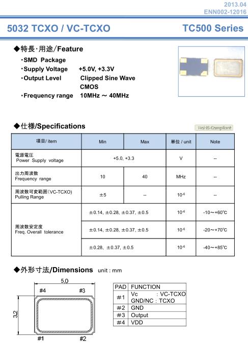 NAKA晶振,TC500晶振,TCXO振蕩器,5032mm體積的石英晶體振蕩器,有源晶振,該產(chǎn)品可驅(qū)動2.5V的溫補晶振,VCXO壓控晶振,VC-TCXO晶體振蕩器產(chǎn)品,電源電壓的低電耗型,編帶包裝方式,可對應(yīng)自動高速貼片機自動焊接,及IR回流焊接(無鉛對應(yīng)),為無鉛產(chǎn)品,超小型,質(zhì)地輕.產(chǎn)品被廣泛應(yīng)用到集成電路,程控交換系統(tǒng),無線發(fā)射基站.