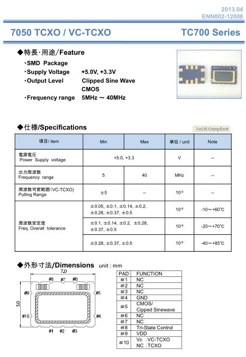 NAKA晶振,TC700晶振,TCXO溫補(bǔ)晶振,小型SMD有源晶振,從最初超大體積到現(xiàn)在的7050mm,6035mm,5032mm,3225mm,2520mm體積,有著翻天覆地的改變,體積的變小也使產(chǎn)品帶來(lái)了更高的穩(wěn)定性能,接縫密封石英晶體振蕩器,精度高,覆蓋頻率范圍寬的特點(diǎn),SMD高速自動(dòng)安裝和高溫回流焊設(shè)計(jì),Optionable待機(jī)輸出三態(tài)輸出功能,電源電壓范圍:1.8V~5V,高穩(wěn)定性,低抖動(dòng),低功耗,主要應(yīng)用領(lǐng)域:無(wú)線通訊,高端智能手機(jī),平板筆記本W(wǎng)LAN,藍(lán)牙,數(shù)碼相機(jī),DSL和其他IT產(chǎn)品的晶振應(yīng)用,三態(tài)功能,PC和LCDM等高端數(shù)碼領(lǐng)域,符合RoHS/無(wú)鉛.