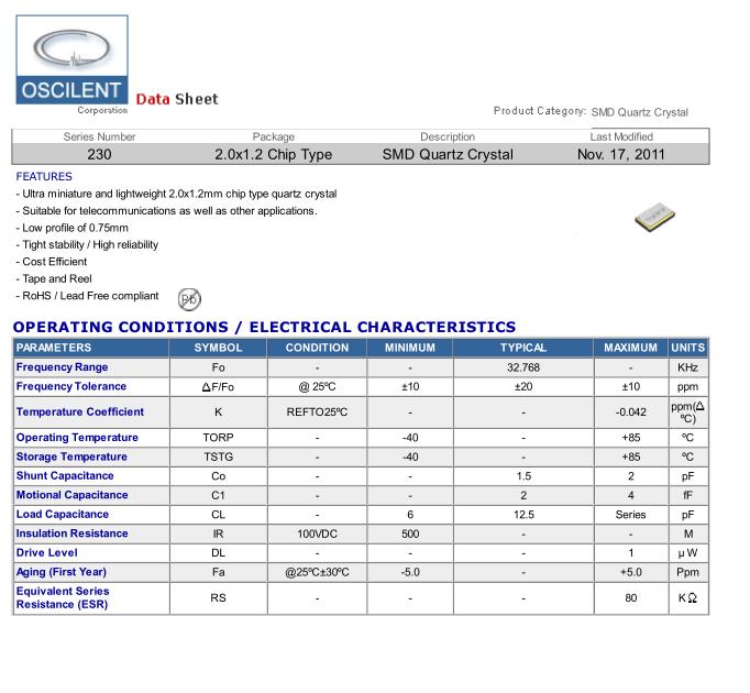 Oscilent晶振,230-32.768K-SR-20-W-TR晶振,2012mm晶振,貼片晶振本身體積小,超薄型石英晶體振蕩器,特別適用于有目前高速發(fā)展的高端電子數(shù)碼產(chǎn)品,因為晶振本身小型化需求的市場領(lǐng)域,小型,薄型是對應(yīng)陶瓷振蕩器(偏差大)和普通的石英晶體振蕩器(偏差小)的中間領(lǐng)域的一種性價比較出色的產(chǎn)品.產(chǎn)品廣泛用于筆記本電腦,無線電話,衛(wèi)星導(dǎo)航SSD,USB,Blu-ray等用途,符合無鉛焊接的高溫回流焊曲線特性.