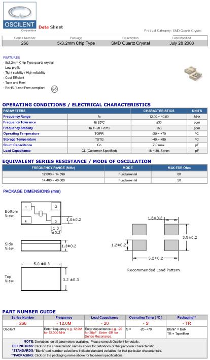 Oscilent晶振,266-12.0M-20-S-TR晶振,無源四腳晶振,智能手機晶振,產品具有高精度超小型的表面貼片型石英晶體振蕩器,最適用于移動通信終端的基準時鐘等移動通信領域.比如智能手機,無線通信,衛星導航,平臺基站等較高端的數碼產品,晶振本身小型,薄型具備各類移動通信的基準時鐘源用頻率,貼片晶振具有優良的電氣特性,耐環境性能適用于移動通信領域,滿足無鉛焊接的高溫回流溫度曲線要求.