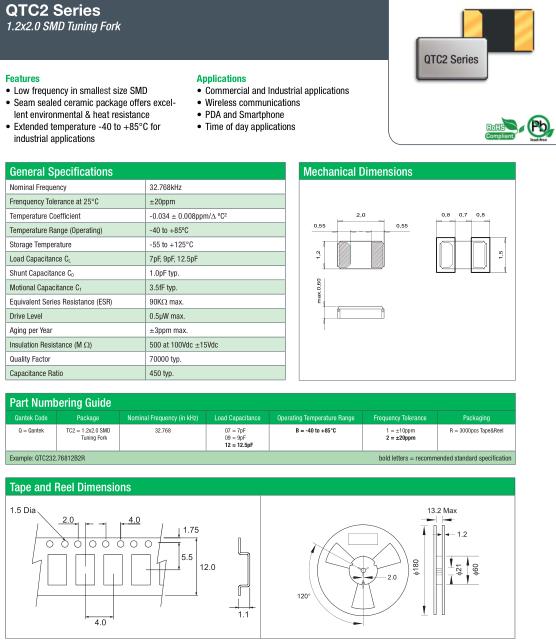 康泰克晶振,QTC2晶振,QTC232.76812B2R晶振,32.768K時鐘晶體具有小型,薄型,輕型的貼片晶振表面音叉型晶體振蕩器,產品具有優良的耐熱性,耐環境特性,可發揮晶振優良的電氣特性,符合RoHS規定,滿足無鉛焊接的高溫回流溫度曲線要求,金屬外殼的封裝使得產品在封裝時能發揮比陶瓷振蕩器外殼更好的耐沖擊性.