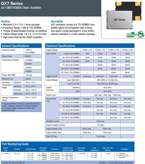 QANTEK晶振,QX7晶振,QX733B20.00000B15R晶振,小型SMD有源晶振,從最初超大體積到現(xiàn)在的7050mm,6035mm,5032mm,3225mm,2520mm體積,有著翻天覆地的改變,體積的變小也使產(chǎn)品帶來了更高的穩(wěn)定性能,接縫密封石英晶體振蕩器,精度高,覆蓋頻率范圍寬的特點,SMD高速自動安裝和高溫回流焊設(shè)計,Optionable待機輸出三態(tài)輸出功能,電源電壓范圍:1.8V~5V,高穩(wěn)定性,低抖動,低功耗,主要應(yīng)用領(lǐng)域:無線通訊,高端智能手機,平板筆記本W(wǎng)LAN,藍牙,數(shù)碼相機,DSL和其他IT產(chǎn)品的晶振應(yīng)用,三態(tài)功能,PC和LCDM等高端數(shù)碼領(lǐng)域,符合RoHS/無鉛.