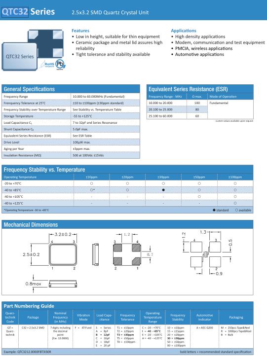 Quarztechnik Crystal集團成立至今已有50多年的歷史, Quarztechnik晶振并稱為夸克晶振,作為德國領先的頻率元件制造商,主要優勢能對客戶提出的要求在短時間內將客戶的需求變為現實,致力于向市場供應優質的Quarztechnik有源晶振,SMD晶振,石英晶體振蕩器等元件,同時具有創新能力與超越自我的勇氣,在業界處于領先的位置,一直在創新,從未被超越的精神,使得Quarztechnik晶振在晶體行業一路輝煌.Quarztechnik晶振,QTC32晶振,QTC3212.0000FBT3I30R晶振.