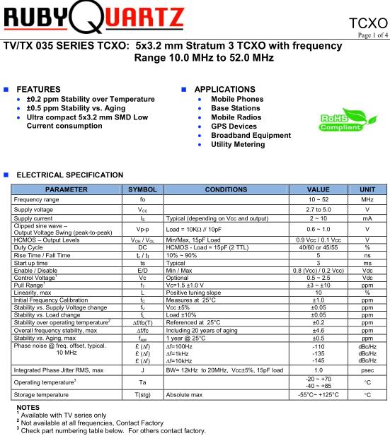 Rubyquartz晶振,TX035晶振,TV035A-D3-0.2-12.000-3-TR晶振,5032mm體積的石英晶體振蕩器,有源晶振,該產品可驅動2.5V的溫補晶振,壓控晶振,VC-TCXO晶體振蕩器產品,電源電壓的低電耗型,編帶包裝方式,可對應自動高速貼片機自動焊接,及IR回流焊接(無鉛對應),為無鉛產品,超小型,質地輕.產品被廣泛應用到集成電路,程控交換系統,無線發射基站.