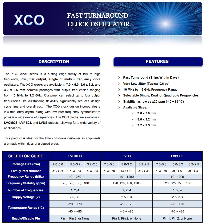 XCO時鐘有源晶振系列是一個從低到高的尖端系列頻率,低抖動輸出,單頻或多頻時鐘振蕩器。XCO時鐘有7.0 x 5.0、5.0 x 3.2和3.2 x 2.5 mm陶瓷封裝,輸出頻率范圍從10MHz到1.2GHz??蛻糇疃嗫梢赃x擇四個輸出頻率。其卓越的靈活性顯著降低了設計周期時間和總成本。XCO時鐘設計包含低頻晶體與低抖動頻率合成器提供寬范圍的頻率。XCO時鐘可在LVCMOS、LVPECL和LVDS輸出,允許多種應用程序。Rubyquartz差分振蕩器,XCO793HU22-156.250,6G路由器晶振.