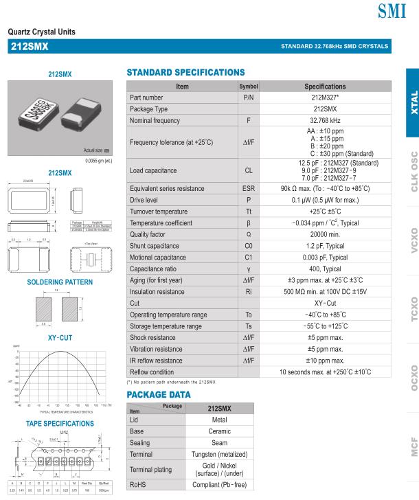 SMI晶振,212SMX晶振,超小型晶振,貼片表晶32.768K系列具有超小型,薄型,質地輕的表面貼片音叉型石英晶體振蕩器,晶振產品本身具備優良的耐熱性,耐環境特性,在辦公自動化,家電領域,移動通信領域可發揮優良的電氣特性,符合無鉛標準,滿足無鉛焊接的回流溫度曲線要求,金屬外殼的石英晶振使得產品在封裝時能發揮比陶瓷晶振外殼更好的耐沖擊性能.