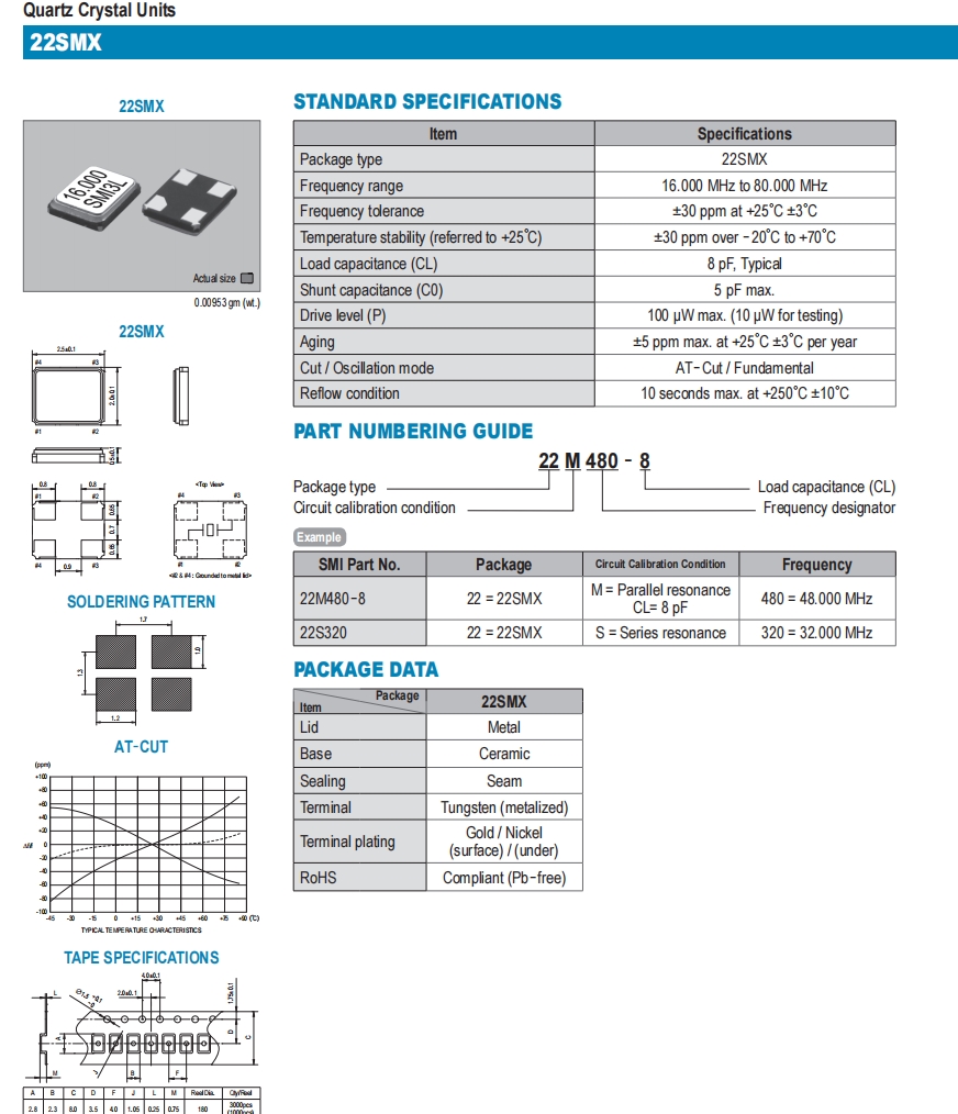 22SMX輕薄型晶振,22M360-8,6GWIFI晶振,SMI石英諧振器 參數(shù)表