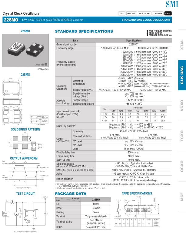 SMI晶振,22SMO晶振,SPXO振蕩器,有源晶振,是指晶體本身起振需要外部電壓供應(yīng),起振后可直接驅(qū)動CMOS集成電路,產(chǎn)品本身已實(shí)現(xiàn)與薄型IC(TSSOP封裝,TVSOP封裝)同樣的1mm厚度,斷開時的消費(fèi)電流是15µA以下,編帶包裝方式可對應(yīng)自動搭載及IR回流焊接(無鉛對應(yīng))產(chǎn)品有幾種電壓供選1.8V,2.5V,3V3.3V,5V,以應(yīng)對不同IC產(chǎn)品需要.
