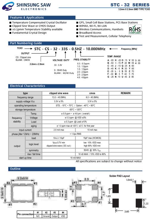 Shinsung晶振,STC-32晶振,STC-CS-32-33S-0.5HZ-20.000MHz晶振,小型SMD有源晶振,從最初超大體積到現在的7050mm,6035mm,5032mm,3225mm,2520mm體積,有著翻天覆地的改變,體積的變小也使產品帶來了更高的穩定性能,接縫密封石英晶體振蕩器,精度高,覆蓋頻率范圍寬的特點,SMD高速自動安裝和高溫回流焊設計,Optionable待機輸出三態輸出功能,電源電壓范圍:1.8V~5V,高穩定性,低抖動,低功耗,主要應用領域:無線通訊,高端智能手機,平板筆記本WLAN,藍牙,數碼相機,DSL和其他IT產品的晶振應用,三態功能,PC和LCDM等高端數碼領域,符合RoHS/無鉛.