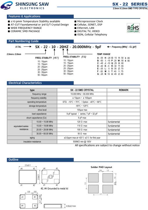Shinsung晶振,SX-22晶振,SX-22-10-20HZ-20.000MHz-9pF晶振,小型貼片石英晶振,外觀尺寸具有薄型表面貼片型石英晶體振蕩器,特別適用于有小型化要求的市場(chǎng)領(lǐng)域,比如智能手機(jī),無(wú)線藍(lán)牙,平板電腦等電子數(shù)碼產(chǎn)品.晶振本身超小型,薄型,重量輕,晶體具有優(yōu)良的耐環(huán)境特性,如耐熱性,耐沖擊性,在辦公自動(dòng)化,家電相關(guān)電器領(lǐng)域及Bluetooth,WirelessLAN等短距離無(wú)線通信領(lǐng)域可發(fā)揮優(yōu)良的電氣特性,滿(mǎn)足無(wú)鉛焊接的回流溫度曲線要求.