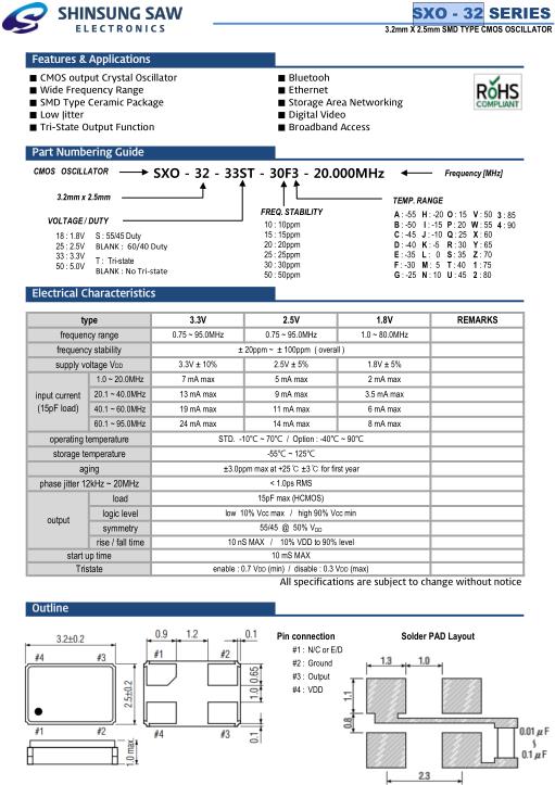 Shinsung晶振,SXO-32晶振,SXO-32-33ST-30F3-24.000MHz晶振,小型SMD有源晶振,從最初超大體積到現在的7050mm,6035mm,5032mm,3225mm,2520mm體積,有著翻天覆地的改變,體積的變小也使產品帶來了更高的穩定性能,接縫密封石英晶體振蕩器,精度高,覆蓋頻率范圍寬的特點,SMD高速自動安裝和高溫回流焊設計,Optionable待機輸出三態輸出功能,電源電壓范圍:1.8V~5V,高穩定性,低抖動,低功耗,主要應用領域:無線通訊,高端智能手機,平板筆記本WLAN,藍牙,數碼相機,DSL和其他IT產品的晶振應用,三態功能,PC和LCDM等高端數碼領域,符合RoHS/無鉛.