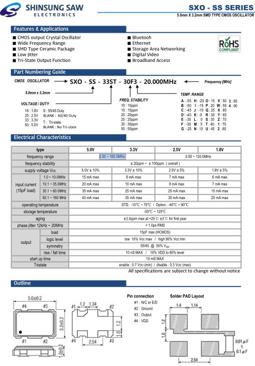 Shinsung晶振,SXO-SS晶振,SXO-SS-33ST-30F3-20.000MHz晶振,5032mm體積的石英晶體振蕩器,有源晶振,該產品可驅動2.5V的溫補晶振,壓控晶振,VC-TCXO晶體振蕩器產品,電源電壓的低電耗型,編帶包裝方式,可對應自動高速貼片機自動焊接,及IR回流焊接(無鉛對應),為無鉛產品,超小型,質地輕.產品被廣泛應用到集成電路,程控交換系統,無線發射基站.