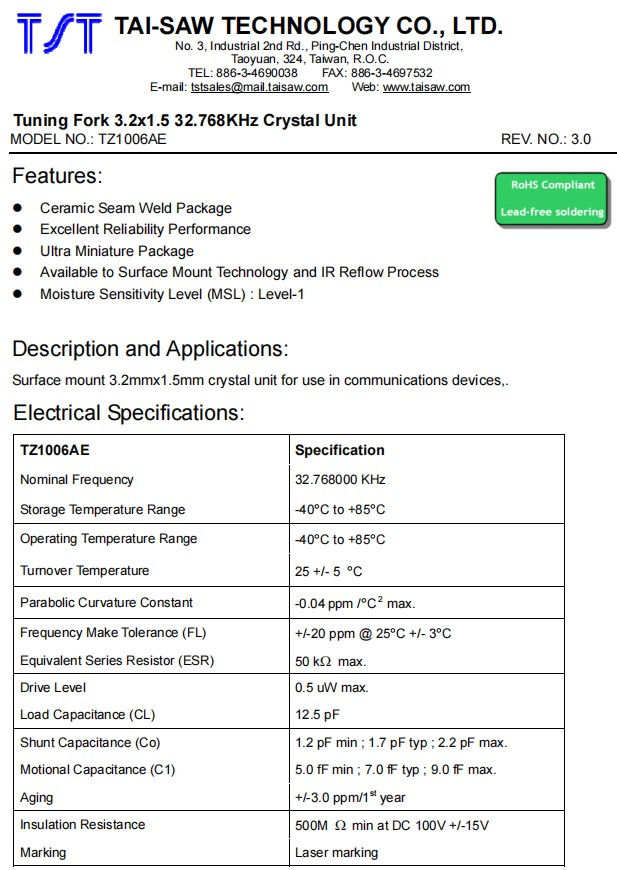 TST無(wú)源晶振TZ1006AE,32.768K石英晶體諧振器,3215貼片晶振,參數(shù)表