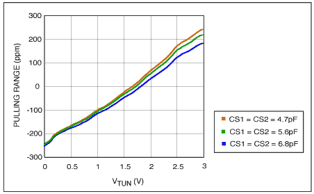 為了限制VCXO的調諧范圍,我們可以通過改變外部并聯電容來設置上限.并聯電容的值在4ps-7ps的范圍內,具體取決于電路板的寄生電容.另一方面,較低的范圍由內部矢量的值確定,其不能在外部改變.為了減少寄生電容對上調諧范圍的影響,在電路板布局中,我們應該盡量減小石英晶振引腳對地的寄生電容,從而在引腳與接地和電源方案之間提供良好的間隙.