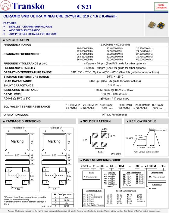 | SPECIFICATION-Transko晶振 | CS21 |
