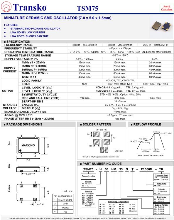 Transko晶振1993年在加利福尼亞州開設晶振生產工廠.為滿足客戶需求便以Transko晶振為公司品牌,開始生產成品石英晶體和石英晶體振蕩器,以及有源晶振等元件.Transko晶振,TSM75晶振,TSM75-H50HM33ST-12.000-TR晶振.