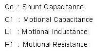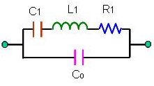 就是將石英晶體共振子轉(zhuǎn)換成振蕩頻率附近的Butterworth-Van Dyke (BVD)等效電路. 在這個(gè)圖中, 有四個(gè)主要參數(shù) : 靜態(tài)電容-Co, 動(dòng)態(tài)電容-C1, 動(dòng)態(tài)電感-L1及動(dòng)態(tài)電阻-R1.
