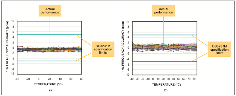 圖3a和3b.回流之前(3a,頂部)和之后(3b,底部)的基于晶體的RTC的數據.數據顯示回流后的轉換率高達±5ppm.