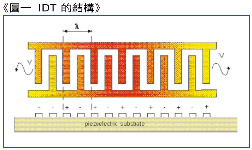 產生表面聲波最簡單的方式,就是利用叉指換能器來直接激發表面聲波,如圖一所示,基本上,叉指換能器分為輸入及輸出兩個部分,它們是一層厚度約2000~3500的鋁薄膜,經由光蝕刻技術成型的壓電單晶材料之基板表面.當一個訊號電厭外加到輸入換能器的正負電極上時,在每對叉指(finger)之問就脅建立電場,M電基板表面一受到電場的作用,便產生同步耦合之上下振動,而激發出表面聲波.常同極叉指間的距離等于表面聲波波長時,所激發的表而聲波效率最大,一般常用的壓電石英晶體基板材料有石英(Quartz),鉬酸鉀(UTa〇3),及鈮酸鋰(LiNb〇3)等.
