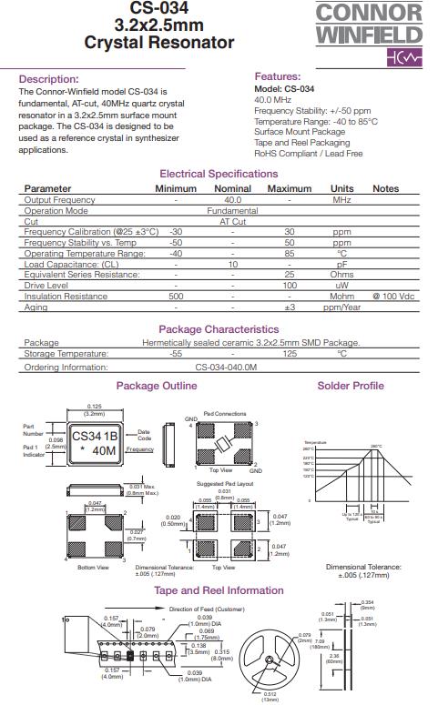 編碼CS-034-027.0M,型號CS-034,Connor-Winfield模型CS-034是基本,at切割,40MHz石英晶體,SMD晶振,無源諧振器,3.2x2.5mm表面安裝的諧振器包中。CS-034被設計成在合成器中用作參考晶體應用程序。