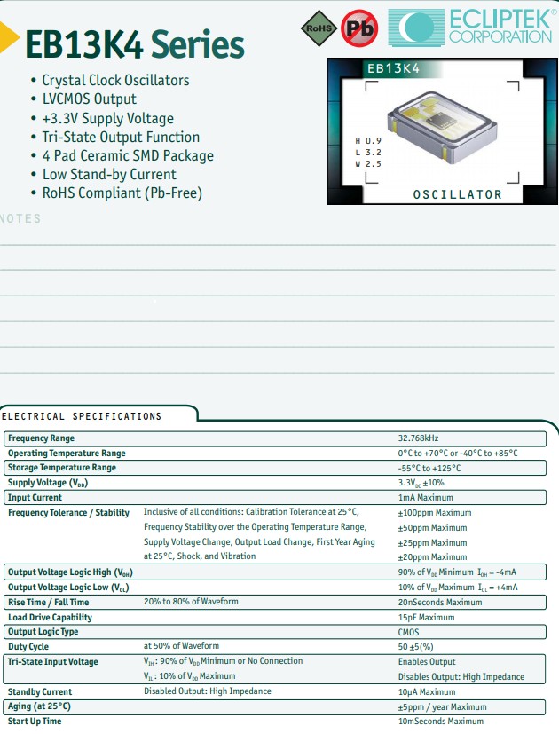 | EB13K2G2H-32.768K | CMOS | 3.3Vdc | SMD 2.0mm x 2.5mm | ±100ppm | -40°C to +85°C | 50 ±5(%) | ±5ppm |
