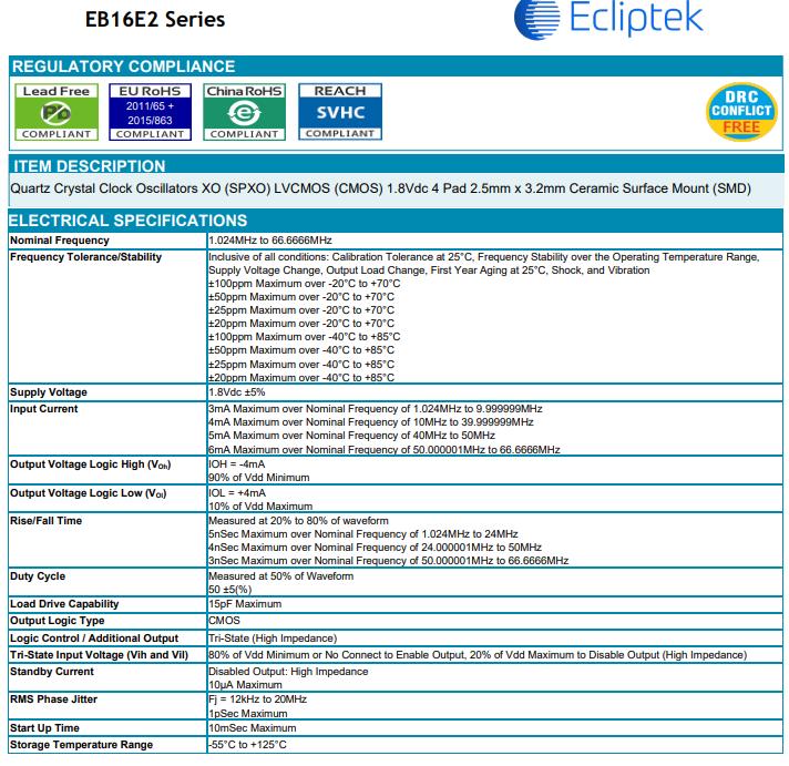 | EB16K2G2H-32.768K | Ecliptek有源振蕩器 | CMOS | 1.8Vdc | SMD 2.0mm x 2.5mm | ±100ppm | -40°C to +85°C |