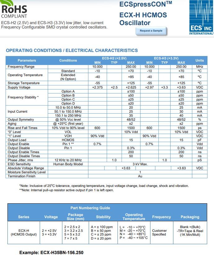 | ECX-H35BN-12.500 | ECS石英晶體振蕩器 | ECSpressCON™ ECX-H | 12.5MHz | -40°C ~ 85°C |