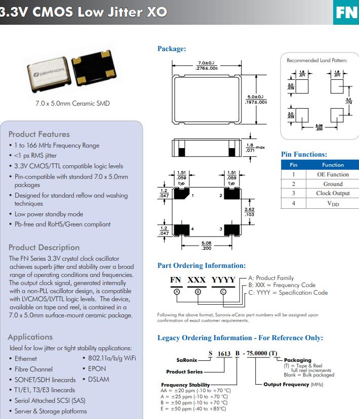 FN系列3.3V晶體時鐘振蕩器實現(xiàn)卓越的抖動和穩(wěn)定的廣泛操作條件和頻率的范圍。內部產(chǎn)生的輸出時鐘信號與非鎖相環(huán)振蕩器設計,是兼容的LVCMOS/LVTTL邏輯電平。的設備,可在磁帶和卷軸上,是包含在一個7.0 x 5.0mm表面貼裝陶瓷封裝。應用程序