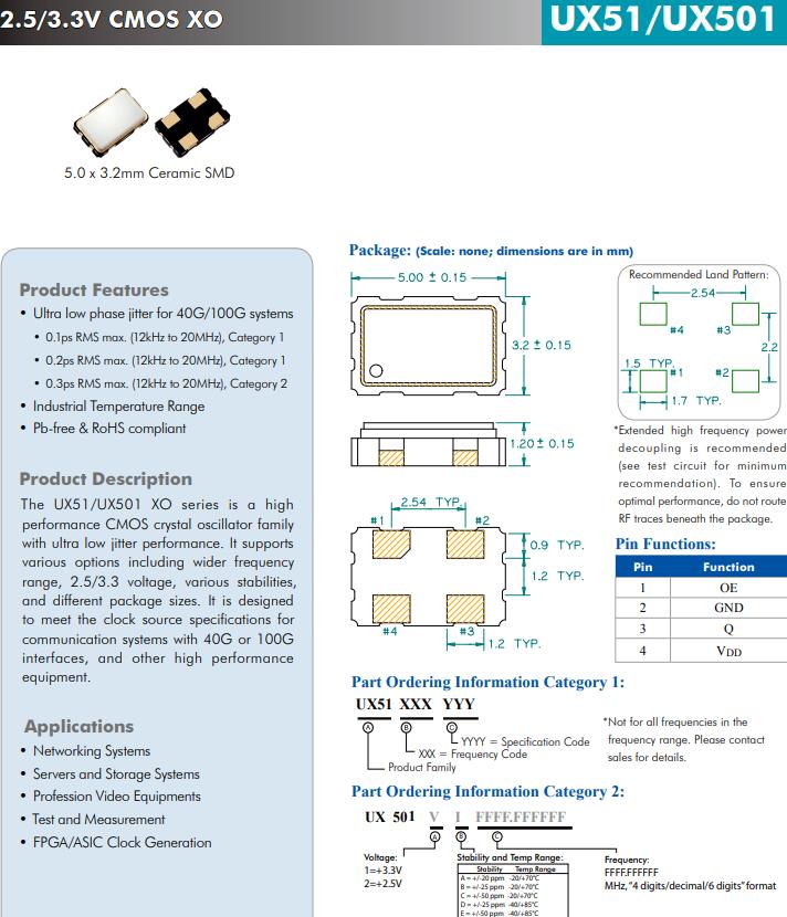 UX51/UX501 XO 系列是具有超低抖動性能的高性能CMOS時鐘振蕩器系列。它支持各種選項,包括更寬的頻率范圍、2.5/3.3 電壓、各種穩定性和不同的封裝尺寸。它旨在滿足具有 40G 或 100G接口的通信系統以及其他高性能設備的時鐘源規范。